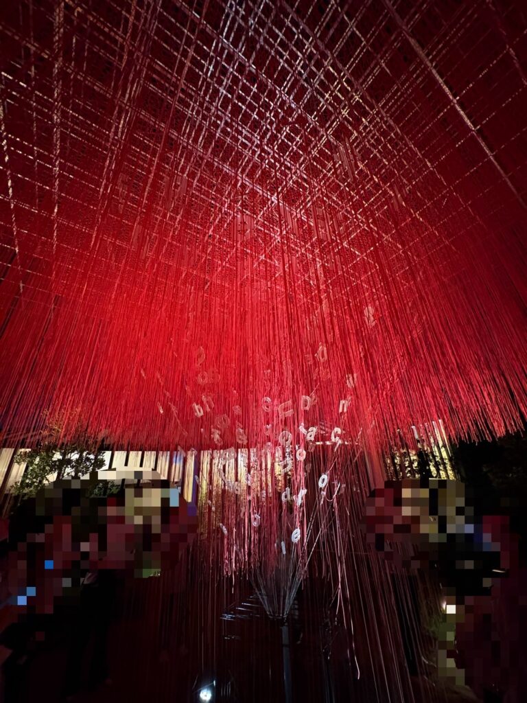 展示は「人と人の共鳴」「人と世界の共鳴」「人と未来の共鳴」という3つのシーケンスで構成されます。赤い糸が張り巡らされたインスタレーション、多言語カウントダウン作品、虹色に輝くサンキャッチャーの展示など、視覚・聴覚・触覚を通じて“響き合う感覚”を体験できるのが魅力です。