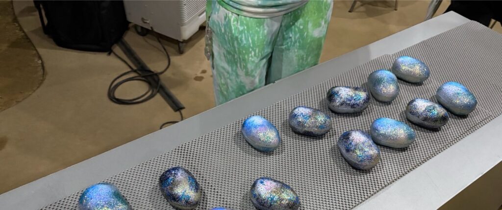 さらに、来場者の体験や選択を記録する専用アプリや、心拍を感じられるようなハプティクスデバイス「echorb」など、テクノロジーを活かした仕掛けも用意されています。まさに、未来の社会における多様な「共生」を体感できる場といえるでしょう。私が体験した時間帯では、蜷川 実花さんがデザインした特別な「echorb」での体験となりました。
