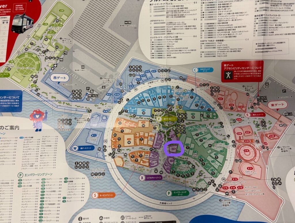 万博会場内での”いのちの未来”の位置は画像の紫枠部分(X02)になります。シグネチャーゾーンと言われるところにあります。大屋根リングの内側にあるパビリオンでウォータープラザ付近にあります。東ゲートから入ると少し近いです。