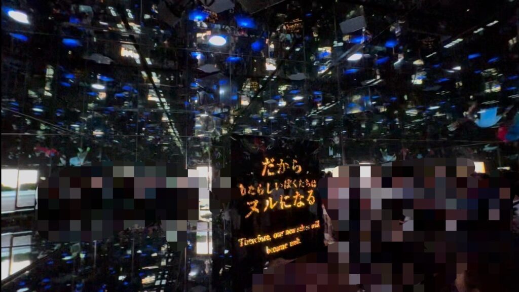 「ダイアログモード」では、「話して、考える」体験となります。部屋に入って映像を見ます。また何人かの参加者が選ばれて、双方向のやり取りを通じて理解や気づきを深めること場面がありました。Mirrored Bodyというアプリを登録して楽しみ体験となっています。中央にある立方体のものに、文字が映し出されるので位置取りは大切になりますので、いい位置を狙いましょう!