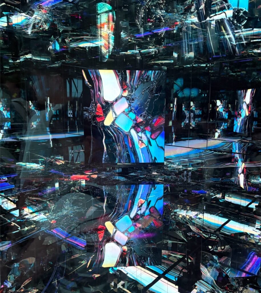 「インスタレーションモード」では、「感じて、浸る」体験となります。「ダイアログモード」で体験した部屋の中には入らずに、外側から作品や演出を体験するモードとなっています。ガラス張りになっている部屋で、様々な映像が流れてくるもので圧巻でした!中央にある立方体に映る映像がとてもきれいでしたね。